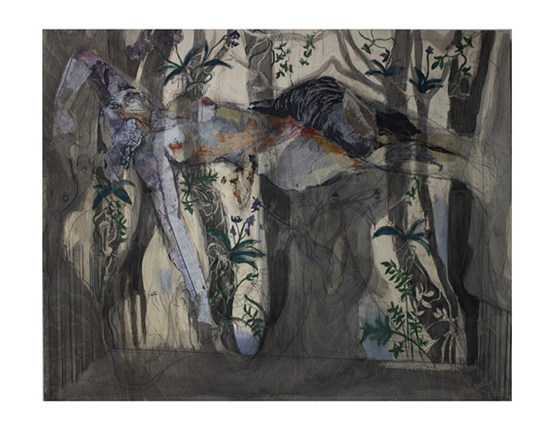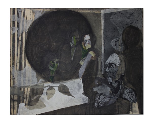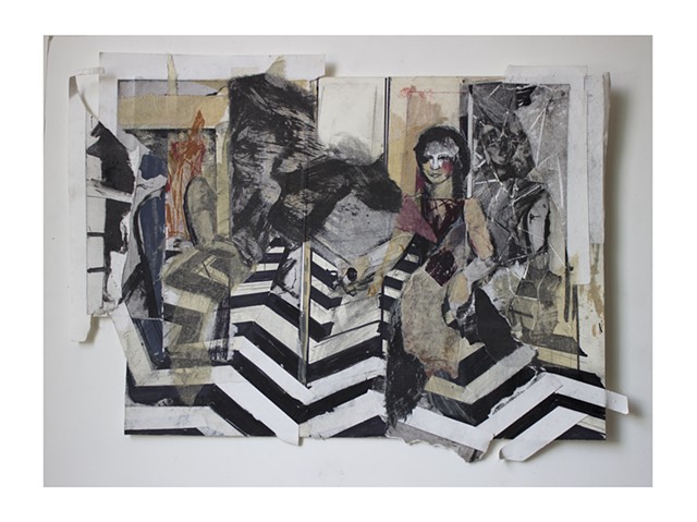 Each piece originates as a charcoal and ink drawing on mylar. The image is transferred to a solar plate through a light-sensitive printmaking process, then printed in multiple variations on thin, translucent paper. These prints are subsequently fragmented and collaged into layered constructions that generate shifting narratives. Through this process, the artist invites viewers to project their own subconscious onto the dark, amorphous forms and to uncover personal meaning within the abstracted, psychological spaces of the work.